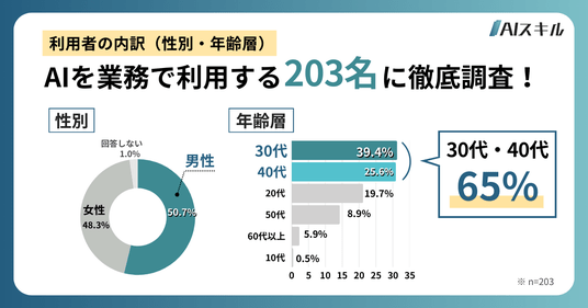 年齢層は30代(39.4%)と40代(25.6%)が合わせて65%を占め、性別も男性(50.7%)、女性(48.3%)とほぼ均等であり、働き盛りの中核層がAIを活用している実態がうかがえます。