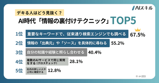 続いて2位には「情報の『出典元』や『ソース』を具体的に尋ねる(55.2%)」がランクイン。これは、AIの特性を理解した上で、AI自身に証拠を提示させるという新時代のスキルです。