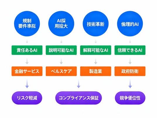 ・ 業界別実装戦略の展開:金融(不正検知、信用評価)、ヘルスケア(診断支援、患者予後予測)、製造(品質検査、予知保全)など、自社業界特有の責任あるAI実装パターンを確立