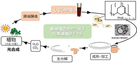 今回の研究成果に基づいた炭素循環サイクルについての概略は下記の通りです。植物(大豆、小麦)を主原料とした醤油醸造より得られる副産物として、しょうゆ油があります。しょうゆ油は、微生物を用いたオールバイオプロセスを経て、生分解性バイオプラスチックへと生まれ変わります。これを原料として生分解性プラスチックが成形・加工され流通されます。基本的にはリサイクル回収できることが望ましいですが、一部環境中に放置されてしまったとしても、生分解する性質があることから、環境中の微生物によって水と二酸化炭素へ変換されます。植物がこれらを用いて光合成することで、再び大豆や小麦が生産される、というサイクルが考えられます。