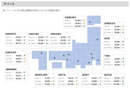 ・コメントでは、30平方メートル 以下を「シングル向き」、30平方メートル ~50平方メートル 以下を「カップル向き」、50平方メートル ~70平方メートル 以下を「ファミリー向き」、70平方メートル 超を「大型ファミリー向き」としています。