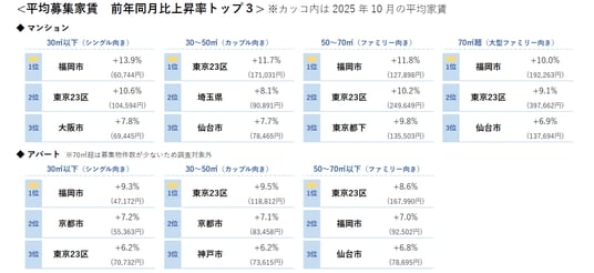 <2025年10月 全国主要都市における賃貸マンション・アパートの平均家賃(面積帯別)>