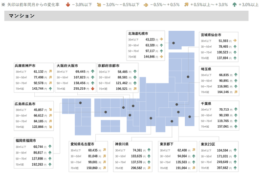 ●マンションは、カップル向き・ファミリー向きが全13エリアで前年同月を上回る。シングル向きでは東京23区が17カ月連続、大阪市が15カ月連続で最高値を更新し、東京23区は4カ月連続で全面積帯において最高値となった。