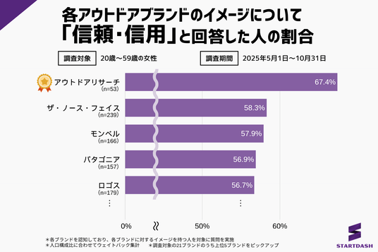 「信頼・信用」イメージが最も高かったのは『アウトドアリサーチ(OUTDOOR RESEARCH)』で67.4%でした。2位は『ザ・ノース・フェイス』で58.3%、3位は『モンベル』で57.9%、4位は『パタゴニア』で56.9%、5位は『ロゴス』で56.7%と続きました。