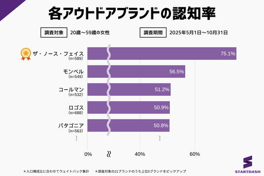 認知率が最も高かったのは『ザ・ノース・フェイス(The North Face)』で75.1%で、約4人に3人が同ブランドを知っているという結果です。2位は『モンベル(mont-bell)』で56.5%、3位は『コールマン(Coleman)』で51.2%、4位は『ロゴス(LOGOS)』で50.9%、5位は『パタゴニア(Patagonia)』で50.8%と続きました。