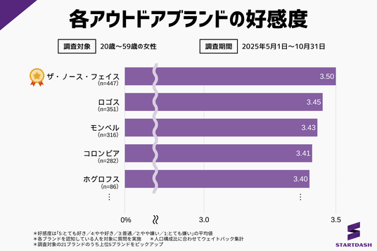 『ザ・ノース・フェイス』が好感度でもトップとなりましたが、上位5ブランドのスコア差は0.10の接戦となっています。また、調査対象となった全21ブランドのスコアは3.07~3.50に分布しており、アウトドアブランド全般が女性から好意的に捉えられていることがわかります。