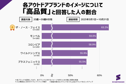 「高品質」イメージが最も高かったのは『ザ・ノース・フェイス』で63.2%でした。2位は『モンベル』で59.0%、3位は『コロンビア』で58.9%、4位は『ワイルドシングス(WILDTHINGS)』で55.9%、5位は『プラスフェニックス(+phenix)』で55.5%と続きました。