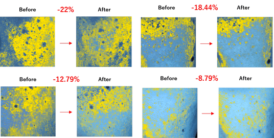 「隠れジミ」は早めの対策で「シミ」になる前に予防することが重要です。今回のモニター調査結果では、約50日間のβ-カロテンの継続摂取を実施した7名のうち6名の隠れジミが、夏終わりの9月と比較して平均で13.4%減少している傾向が確認されました。