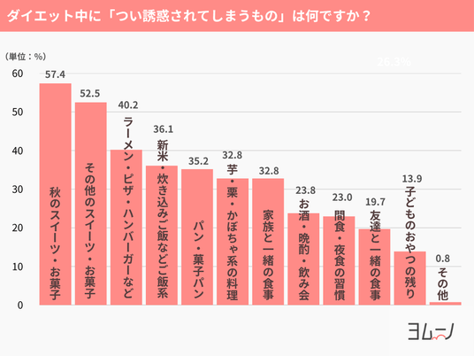 また、「その他のスイーツ・お菓子(52.5%)」「ラーメン・ピザ・ハンバーガーなどハイカロリーなもの(40.2%)」が2位・3位と続く結果に。甘いものやジャンキーな食事は、ダイエットの大敵であり続けていることが浮き彫りになりました。