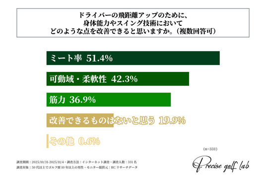 ・ゴルフ歴10年以上の男性シニアゴルファーが、ドライバーの飛距離アップのために、身体能力やスイング技術において改善できると考えることは主に「ミート率」や「可動域・柔軟性」