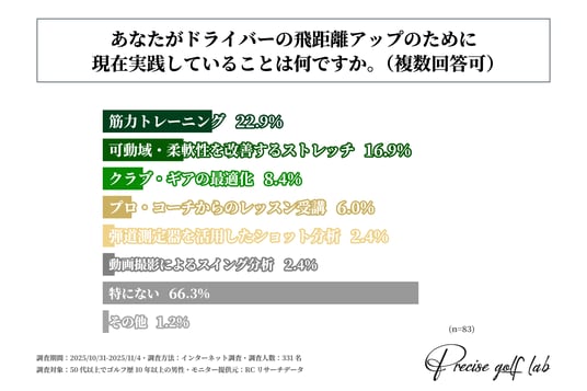 続いて、若い頃と比べてドライバーの飛距離が伸びた・変わらないと回答した人を対象に「ドライバーの飛距離アップのために現在実践していることは何か」を尋ねる設問への回答では、1位が「特にない」で66.3%、2位が「筋力トレーニング」で22.9%、3位が「可動域・柔軟性を改善するストレッチ」で16.9%、という結果になりました。この結果から、若い頃と比べてドライバーの飛距離が伸びた・変わらない人の約65%はドライバーの飛距離アップのために特に何も実践していないものの、何らかの対策を実践している人は、主に「筋力トレーニング」や「可動域・柔軟性を改善するストレッチ」を行っていることが判明しました。