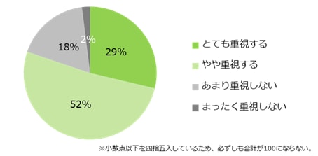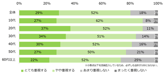 1:81%が、仕事を選ぶ際、服装や働き方など職場のルールの自由度を重視すると回答。(図1~2)「仕事を選ぶ際、職場のルール(服装、髪型、働き方など)の自由度をどの程度重視しますか?」と伺うと、81%が「重視する」と回答しました(とても重視する:29%、やや重視する:52%)。年代別で見ると、10代・20代が最も多く(10代:89%、20代:89%)、60代以上(74%)と15ポイントの乖離があり、若い年代ほど柔軟に働ける職場環境を求める傾向にあることがうかがえます。