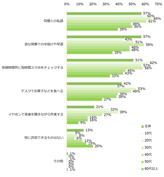 次に、勤務中の“働き方・過ごし方”について許容できるものを伺いました。最多は「同僚との私語」「急な用事での中抜けや早退」(同率57%)でした。年代別では、10代のみ「休憩時間外に短時間スマホをチェックする」(62%)が最多で、60代以上と29ポイントの乖離がありました(60代以上:33%)。