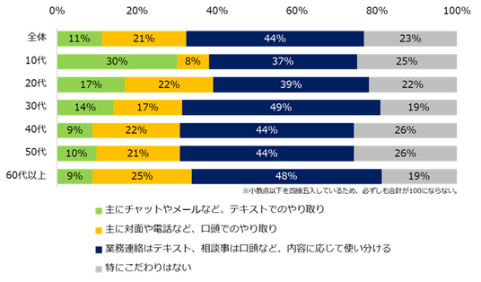 続けて、職場の“コミュニケーション”について望ましい手法を伺うと、トップは「業務連絡はテキスト、相談事は口頭など、内容に応じて使い分ける」(44%)でした。年代別で見ると10代が最も「主にチャットやメールなど、テキストでのやり取り」(30%)を好む傾向にあり、10代のみ「主に対面や電話など、口頭でのやり取り」を望む割合が1割を切りました。職場に求めるものや働く価値観に世代間の差が見られました。