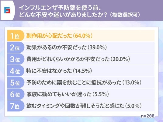 使用前に感じた不安として最も多かったのは「副作用が心配だった」(64.0%) という回答でした。