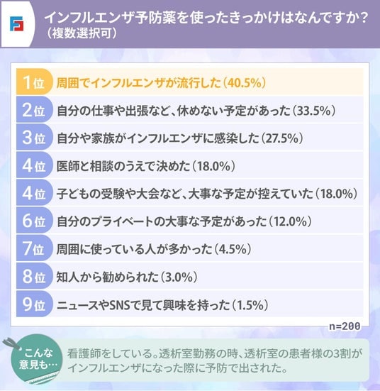 また、医療現場でもインフルエンザの拡大を防ぐ目的で予防薬が使われることがあり、看護師の方からは「患者様の3割がインフルエンザになった際に、予防目的で薬が処方された」という声も寄せられました。