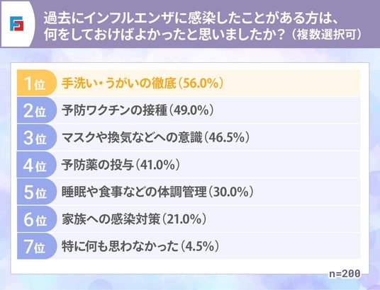 インフルエンザに感染した経験がある人に、どんな対策をしておけば良かったと思うか尋ねたところ、「手洗い・うがいの徹底」や「予防ワクチンの接種」「マスクや換気などへの意識」などの基本的な対策が多く挙がりました。