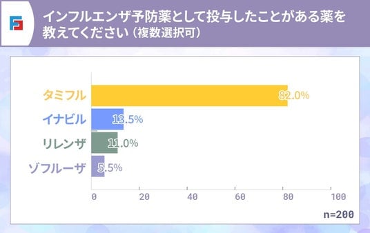 インフルエンザ予防薬として利用した薬を尋ねたところ、最も多かったのは「タミフル(オセルタミビル)」 という結果となりました。