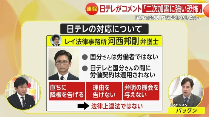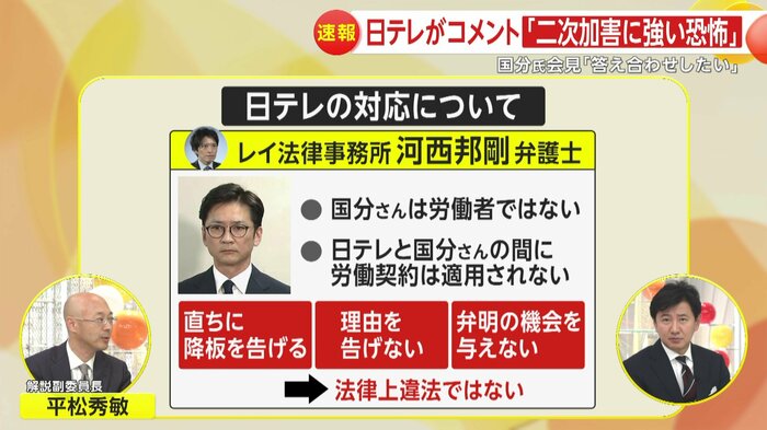 ぱっと見では、日本テレビの対応は“だまし討ち”のように見えるじゃないですか。しかし、仮にヒアリングについて事前に国分氏側に伝えると、口裏合わせや証拠隠滅のおそれがありますから、日本テレビ側の対応としてはやむを得ないかなと思います。