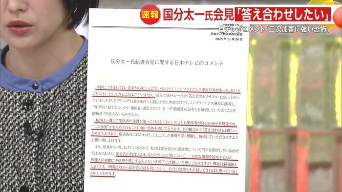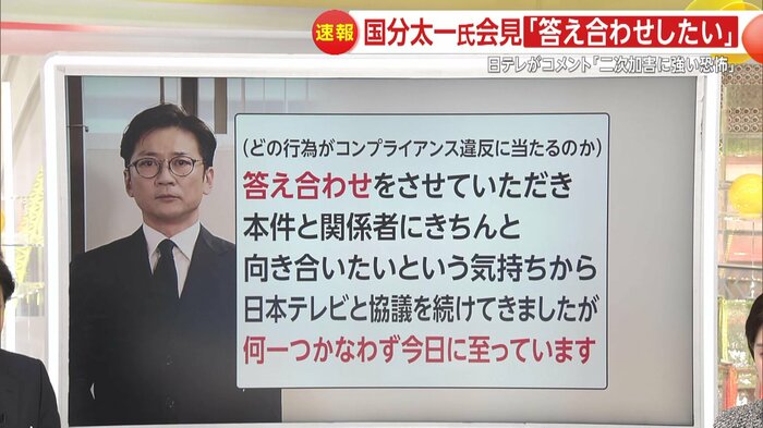 国分さんは10月に日本日本テレビの対応を巡って日弁連に人権救済の申し立てを行っていますが、この会見の中で「(どの行為がコンプライアンス違反に当たるのか)答え合わせをさせていただき、本件と関係者にきちんと向き合いたいという気持ちから、日本テレビと協議を続けてきましたが、何一つかなわず今日に至っています」と説明しました。