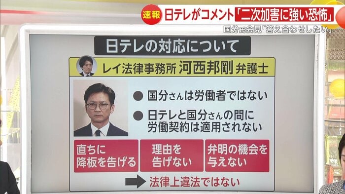 芸能界の労働問題などに詳しいレイ法律事務所の河西邦剛弁護士によると、国分氏は労働者ではないので日本テレビと国分さんの間に労働契約は適用されない。