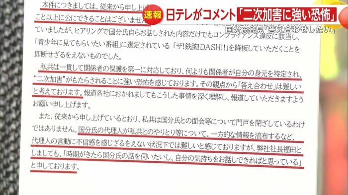 日本テレビはコメントで、「国分氏の代理人が私共とのやり取り等について、一方的な情報を流布するなど、代理人の言動に不信感を感じざるをえない状況下では難しいと感じておりますが、弊社社長福田としましても、『時期が来たら国分氏の話を伺いたいし、自分の気持ちをお話できればと思っている』と申しております」としています。