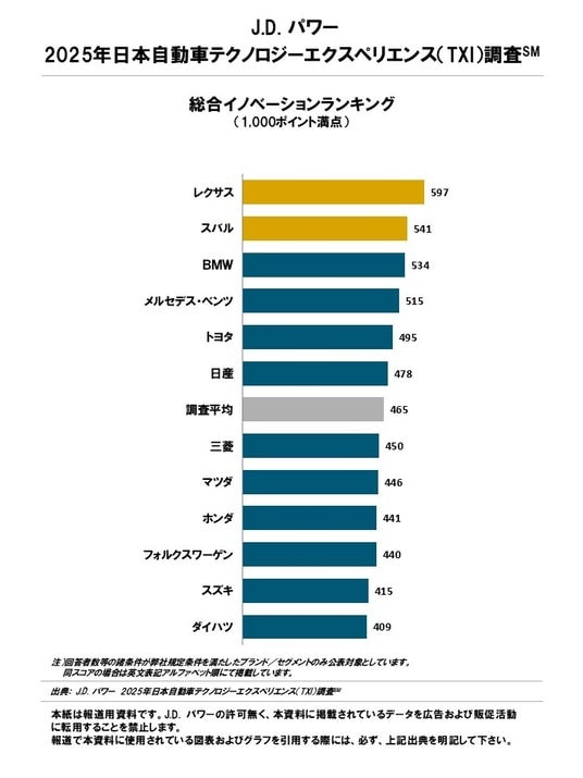 レクサスが3年連続でブランド総合1位、マスマーケットブランドではスバルが5年連続の1位