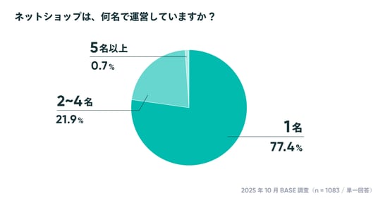 ネットショップの運営人数は、「1名」が77.4%ともっとも多く、次いで「2~4名」が21.9%と、2019年調査開始時から変わらず、4名以下のショップが99.3%と9割超となりました。