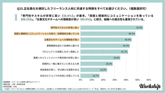 正社員化の検討対象となるフリーランス人材に見られる特長は、「専門性やスキルが非常に高い(55.0%)」という実務能力に関する項目が最多となりました。