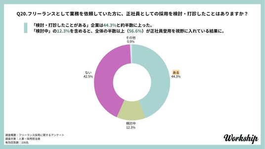 さらに「検討中(12.3%)」を含めると、全体の56.6%と、半数以上の企業がフリーランスを正社員登用の視野に入れていることが明らかになりました。