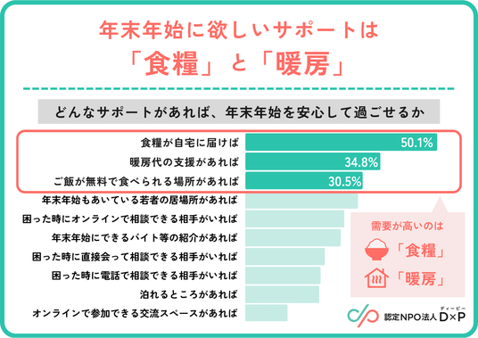 2.困窮する若者の年末年始に欲しいサポートとして「食糧支援」および「暖房代(光熱費)支援」ニーズが高い。
