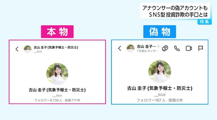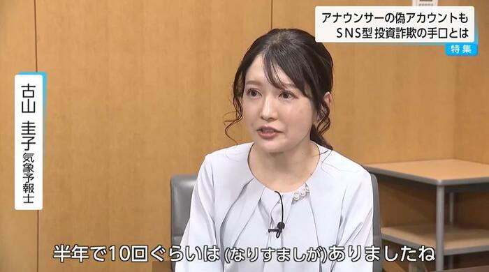 こうしたSNS型投資詐欺は、まず相手を信用させることが重要であるため、県民にとって親近感のある地方テレビ局のアナウンサーなどが偽アカウントの標的になりやすい。テレビ宮崎の夕方ニュースで気象情報を伝えている古山圭子気象予報士も、偽アカウントを作られている。しかも1回ではなく、繰り返されているという。古山気象予報士も、オカファーアナも、繰り返し作られる偽アカウントに怒りを覚えている。