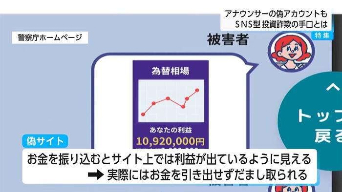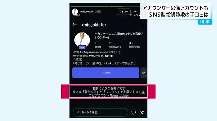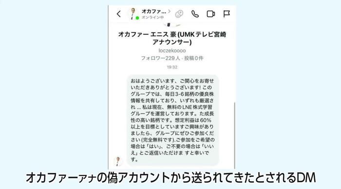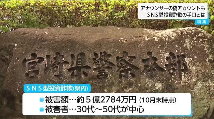 SNS上で、実在する著名人やテレビ局のアナウンサーなどを装った「偽アカウント」が横行している。テレビ宮崎のアナウンサーや気象予報士も「偽アカウント」を繰り返し作られた。ダイレクトメッセージ(DM)を通じて投資話を持ちかけ、金銭を騙し取る「SNS型投資詐欺」による宮崎県内の被害額は、10月末時点で約5億2784万円に上り、30代から50代を中心に被害が拡大している。