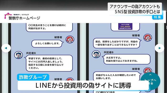 その後、詐欺グループは投資用の偽サイトに誘導。そこにお金を振り込むとサイト上では利益が出ているように見えるが、実際には引き出すことができず騙し取られてしまう。
