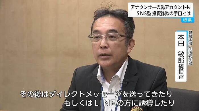 宮崎県警本部 生活安全部の本田敏郎統括官は、SNS型投資詐欺の手口について「最初はSNSで接触し、その後ダイレクトメッセージを送ってきたりLINEに誘導したりして、言葉巧みに長時間、毎日のように連絡を取り続けることで相手を信用させる」と説明する。