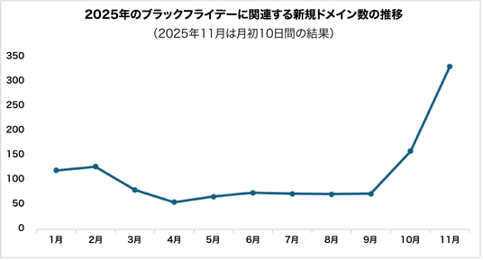 毎年恒例のショッピングシーズンが到来すると、新規ドメインの登録が急増し、犯罪者は不正インフラを作り出して紛れ込む好機を得ます。本年10月にはブラックフライデー関連の新規ドメイン登録が158件に上り、2025年の月間平均との比較で93%増という驚異的な増加を記録しました。11月上旬にはさらにその増加が加速し、上旬の10日間で330以上の関連する新規ドメインが出現しています。