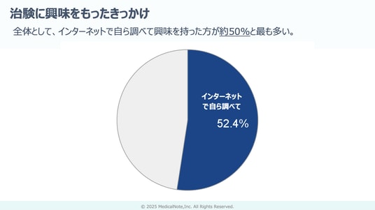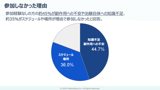 特に注目すべきは、治験に興味を持ったきっかけとして「インターネットで自ら調べた」と回答した人が52.4%と最も多く、マスメディア(25%)や医師からの紹介(9%)を大きく上回っている点です。一方で、参加に至らなかった理由として「治験自体への知識不足(44.7%)」「場所やスケジュールが合わない(36.0%)」などが上位に挙がっており、適切なタイミングで詳細な情報にアクセスできていない現状が浮き彫りとなりました。