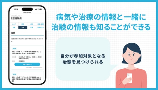 こうした「情報のミスマッチ」を解消するため、今回新たに提供を開始した機能では、ユーザーが自身の病気について調べている疾患ページ内に「治験」タブを新設しました。