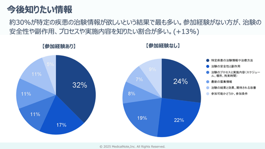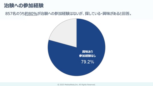 当社が実施した会員向け調査では、回答者の約80%(79.2%)が「治験への参加経験はないが、情報は探している・興味がある」と回答しており、治験に対する高い潜在ニーズが明らかになりました。
