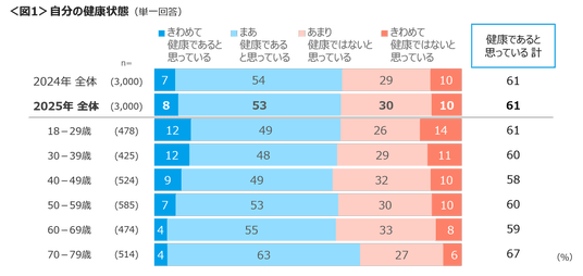 自分の健康に対し「きわめて健康」は8%、「まあ健康」は53%、合わせて健康であると思っている人は61%と前年と同じ結果である。ほぼすべての年代で「きわめて健康」よりも「きわめて健康ではない」が上回り、若い世代ほど高まる傾向にある。<図1>