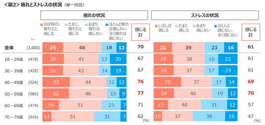 普段の生活で「ほぼ毎日、疲れたと感じる」は24%と「たまに、疲れたと感じる」46%と合わせて70%の人が疲れを実感。毎日の生活でイライラやストレスを「しばしば感じる」は22%、「たまに感じる」39%と合わせて61%はストレスを感じている。40~50代は生活における疲れやストレスの度合いがいずれも強い年代であった。<図2>