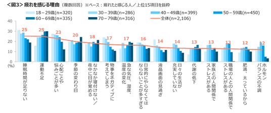 疲れを感じる理由としては「睡眠時間が足りない」「運動不足」「心配ごとや悩みごとが多い」がTOP3。若い年代ほど、睡眠時間の不足や心配・悩みごとを疲れの理由としてあげていた。70代は「季節の変わり目」「なかなか寝付けない/夜中に目が覚める」が2~3番手にあがる。<図3>
