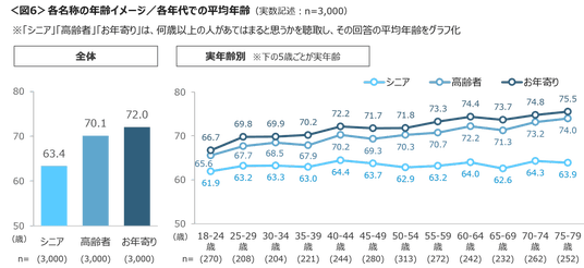 名称に対する年齢イメージを実数で確認した。「シニア」は平均で63.4歳、「高齢者」は70.1歳、「お年寄り」は72.0歳。実際の年齢にかかわらず「シニア」の年齢イメージは大きく変わらない。「高齢者」「お年寄り」は55~59歳を境に年齢イメージが高くなる。<図6>