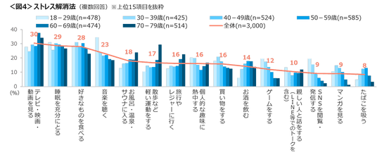 ストレス解消法は「テレビ・映画・動画を観る」「睡眠を充分にとる」「好きなものを食べる」「音楽を聴く」が2割台で上位。18~29歳は「音楽を聴く」が35%と1番手、70代では「散歩など軽い運動をする」が29%と2番手にあがった。<図4>