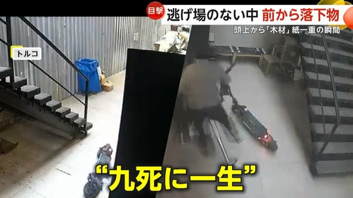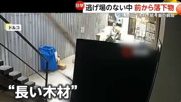 まさに九死に一生。木材は解体作業中の建物から落下したものだという。