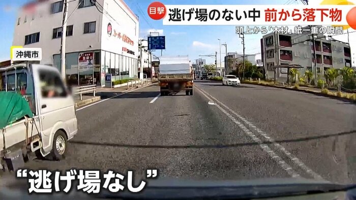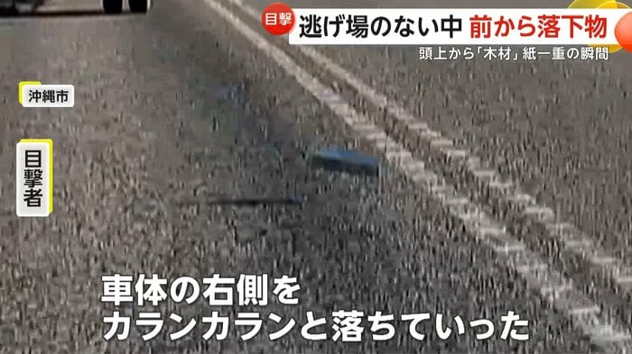 22日午前9時前、沖縄市でカメラが捉えたのは、前を走るトラックの荷台あたりから回転しながら落ちてくる“何か”だ。その“何か”は、運転席側に向かって飛んできた。