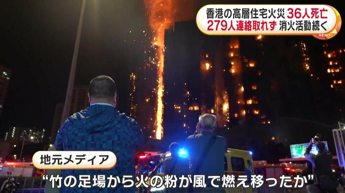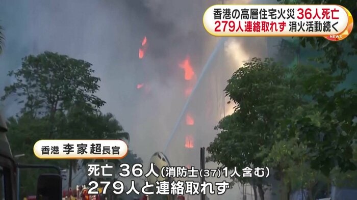 香港の高層住宅で起きた大規模火災で、36人が死亡し、279人と連絡が取れなくなっている。