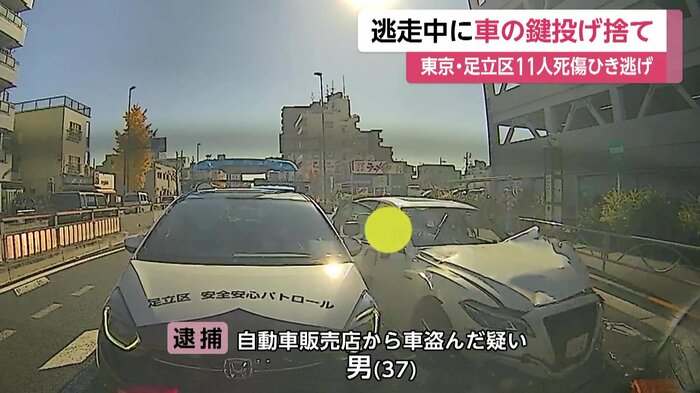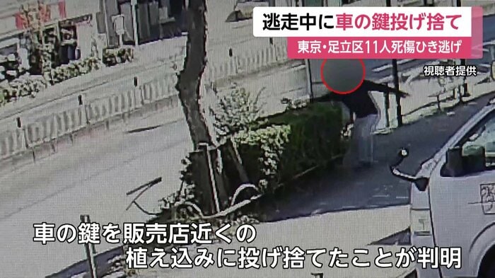東京・足立区で11人が死傷したひき逃げ事件で、事故の後逮捕された男が、逃走途中に車の鍵を植え込みに投げ捨てていたことが分かった。