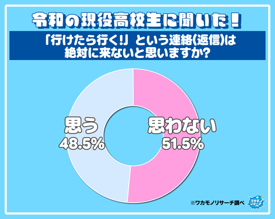 「行けたら行く」という連絡(返信)で「絶対来ないとは思わない」と回答した51.5%の高校生からは、