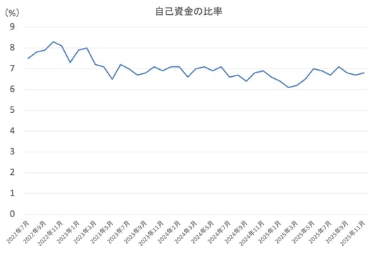 物件価格+リフォーム額+不動産諸費用+ローン諸費用の合計を総資金計画として、それに対する自己資金拠出の割合(%)を算出したところ、緩やかに低下し6~7%程度となっています。インフレ環境下で、自己資金を温存し、できるだけ多く借り入れようとする動きが続いています。また、リフォーム費用や諸費用含めて融資できるよう、住宅ローンの商品改善がなされてきていることから、今後も低水準で推移するものと考えられます。
